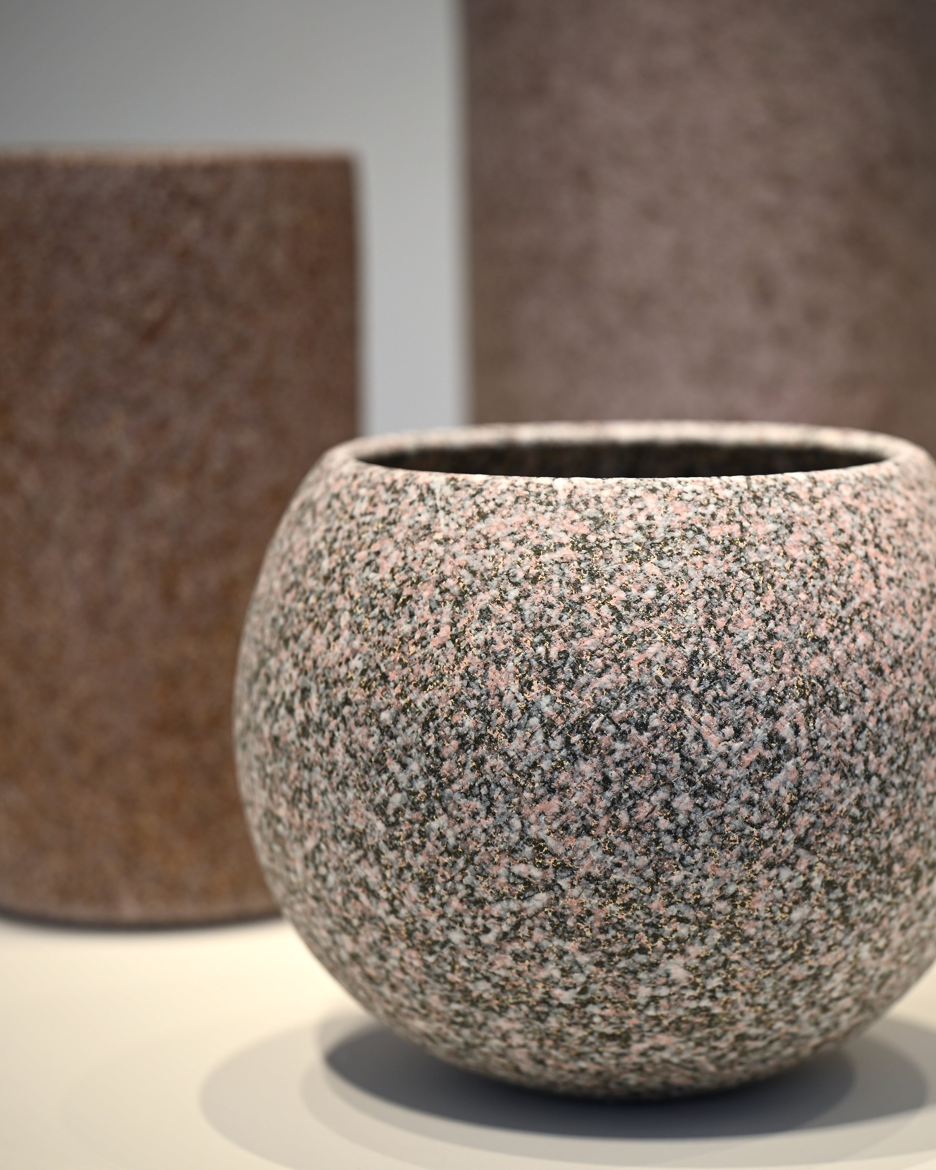 En serie stora handdrejade stengodsvaser i återvunna leror.